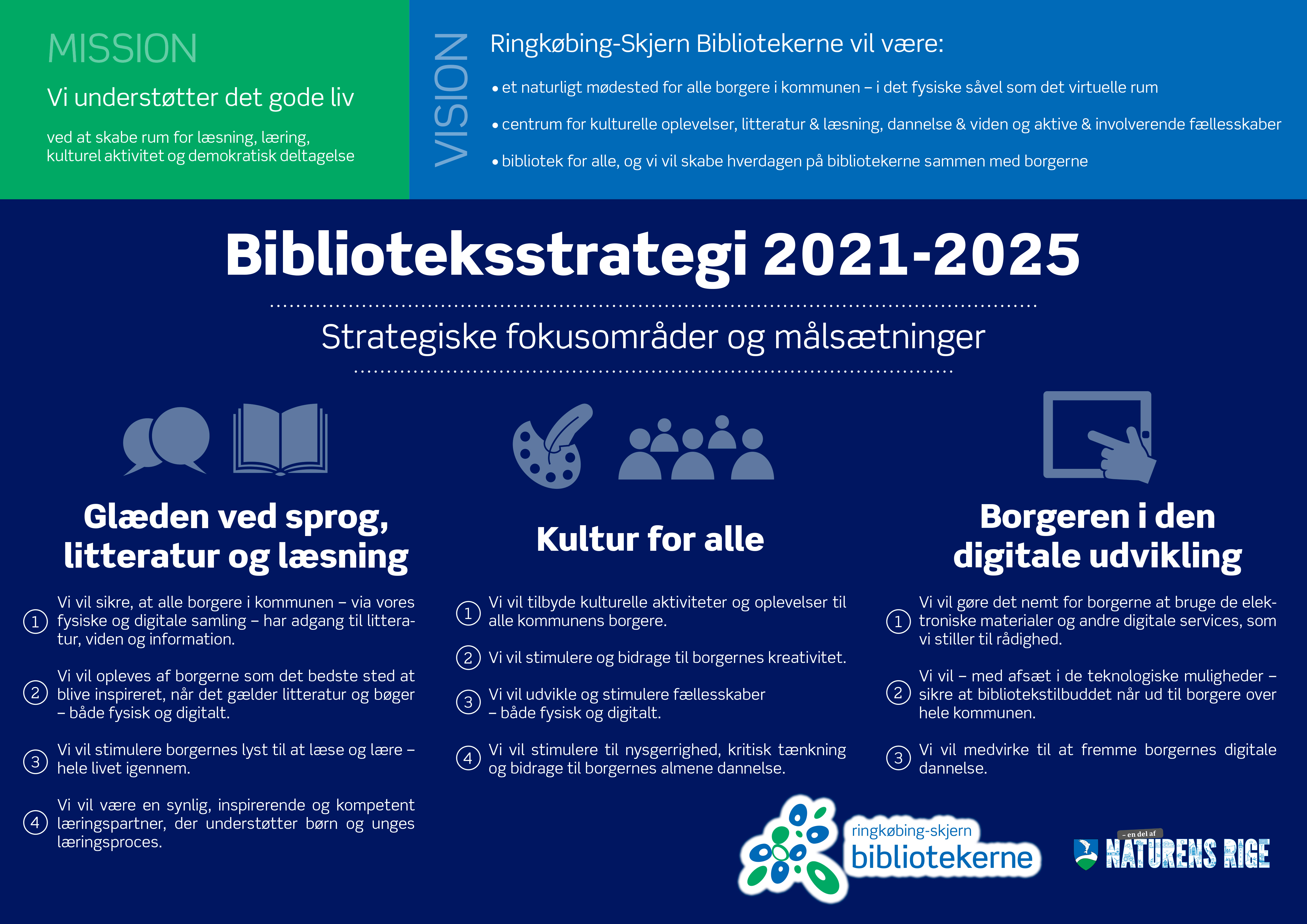 Vi understøtter det gode liv ved at skabe rum for læsning, læring, kulturel aktivitet og demokratisk deltagelse.